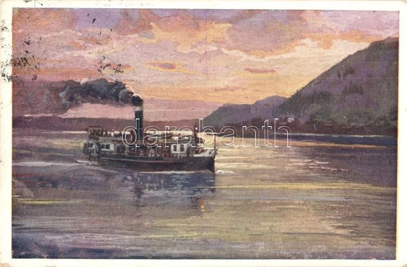 Visegrád, esti hangulat gőzhajóval. MFTR Művészlevezőlap https://www.darabanth.com/hu/322-Gyorsarveres/322.0/Kepeslapok/Magyarorszag~2000006/Visegrad-esti-hangulat-gozhajoval-MFTR-Muveszlevezolap~II1659431