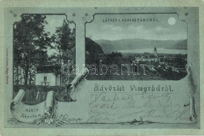 Leírás: Visegrád, látkép a hegysétányról, templom, Mária kápolna. Zoller József kiadása, floral, Art Nouveau (EK)