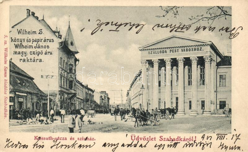 Szabadka, Subotica; Kossuth utca és színház, Szálloda Pest városához, Farkas J. és Wilhelm János üzlete. Wilhelm Samu könyv és papírárus üzlete és kiadása / street and theatre, shops