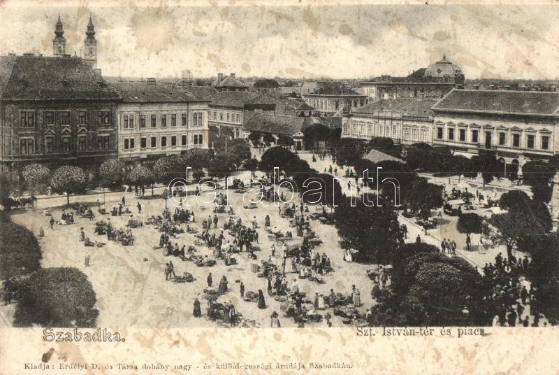 Szabadka, Subotica; Szent István tér és piac / market square (fl) https://www.darabanth.com/hu/322-Gyorsarveres/322.0/Kepeslapok/Vajdasag~2000011/Szabadka-Subotica-Szent-Istvan-ter-es-piac-market-square-fl~II1630319