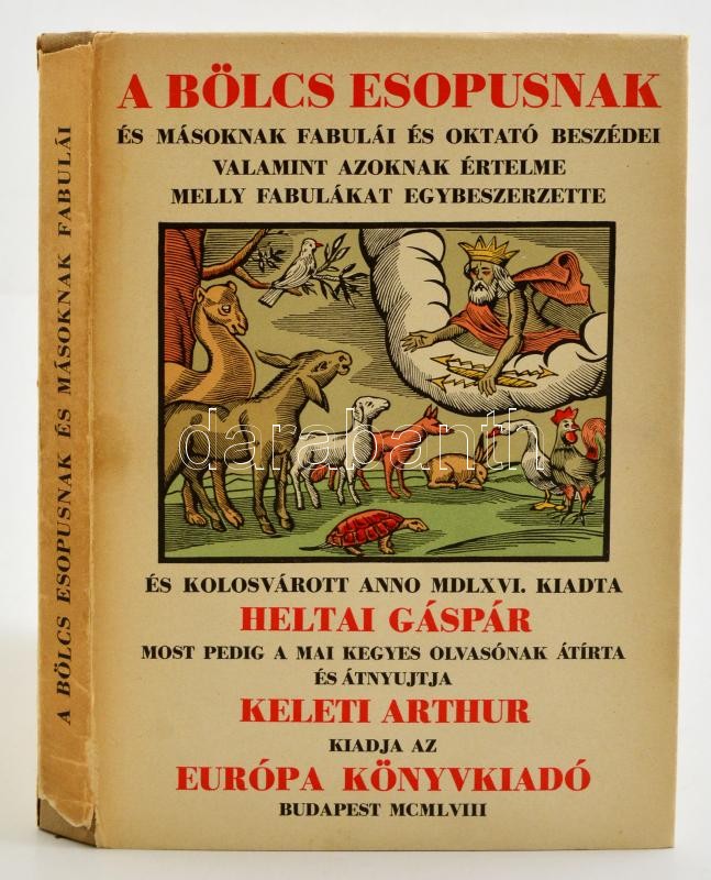 A Bölcs Esopusnak és másoknak fabulái és oktató beszédei, valamint azoknak értelme melly fabulákat egybeszerzette és Kolosvárott anno MDLXVI, Kkiiadta Heltai Gáspár, most pedig a mai kegyes olvasónak átírta és átnyujtja Keleti Arthur. Bp., 1958, Európa, 159 p. Kiadói egészvászon-kötés, kiadói papír védőborítóban, apró hiánnyal a geroincen.Tékával
