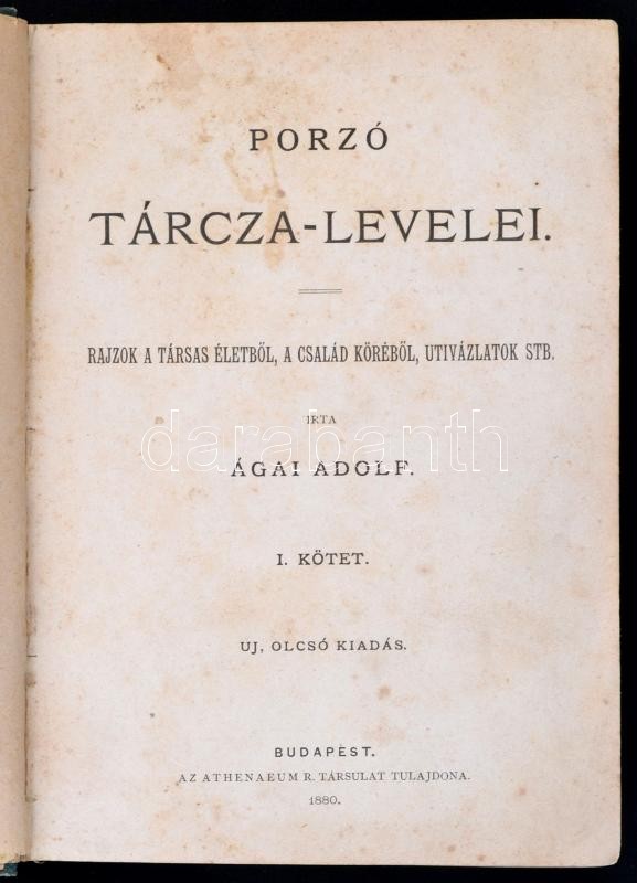 Ágai Adolf: Porzó tárcza-levelei I. kötet. Rajzok a társas életből, a család köréből, utivázlatok stb. Bp., 1880, Athenaeum, XVI+395+2 p. Modern kopottas félvászon-kötés, 94-95. oldal foltos, de egyébként jó állapotban. Csak I. kötet.