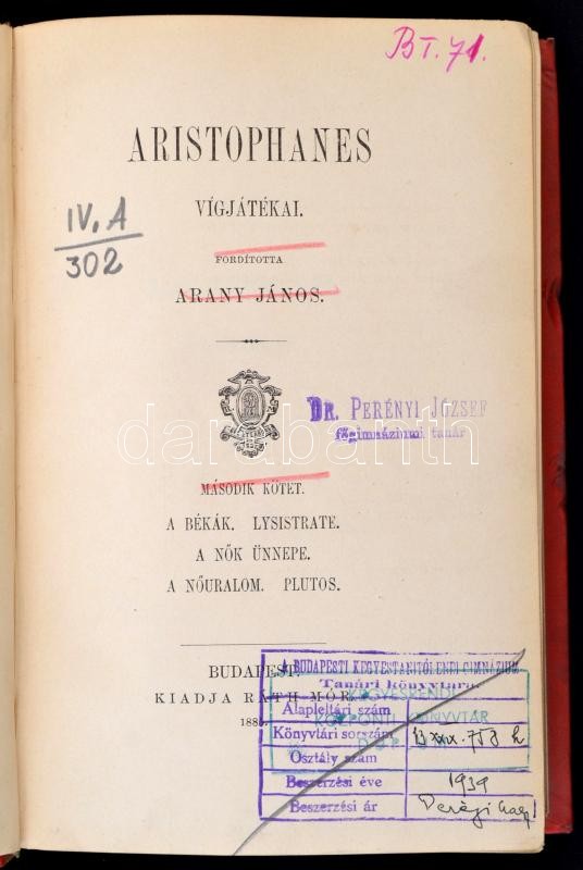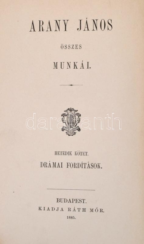 Arany János összes munkái 7-8. köt.: Drámai fordítások. Bp., 1885, Ráth Mór. Kissé sérült, gazdagon díszített, aranyozott vászonkötésben, egyébként jó állapotban.