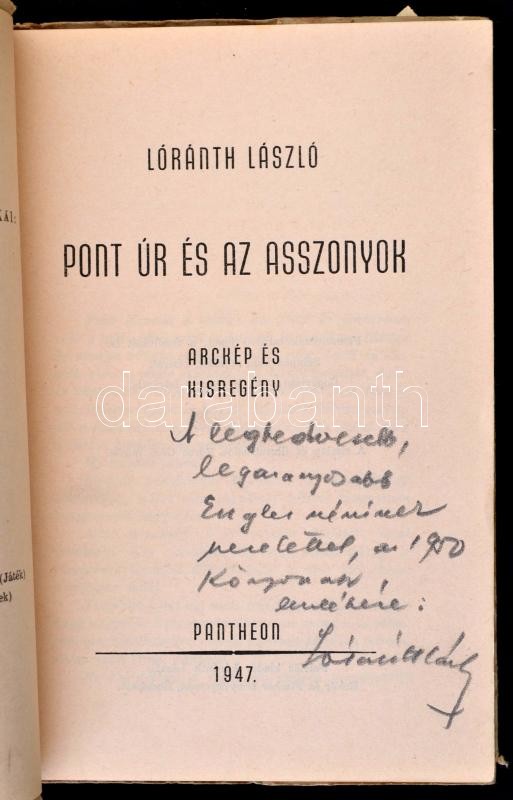 Lóránth László: Pont úr és az asszonyok. A borító Vörös Géza (1897-1957) festő, grafikus munkája. Bp.,1947, Pantheon. Kiadói illusztrált papírkötés, kiadói szakadozott papír védőborítóban. A szerző, Loránth László (1905-1966) által dedikált. Első kiadás.