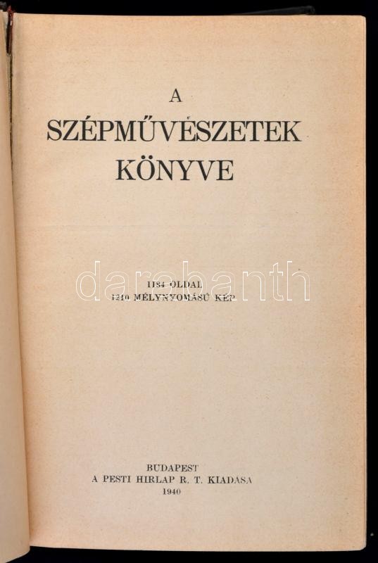 Pesti Hírlap könyvtára. A szépművészetek könyve. Bp., 1940, Pesti Hírlap Rt. Kiadói aranyozott gerincű egészvászon-kötés, kopott borítóval, és gerinccel.