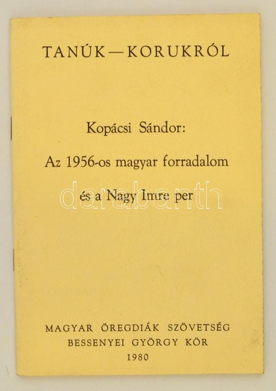 Kopácsi Sándor: AZ 1956-os magyar forradalom és a Nagy Imre per. Tanúk-korukról. New Brunswick, 1980, Magyar Öregdiák Szövetség - Bessenyei György Kör, 64 p. Második kiadás. Kiadói papírkötésben, jó állapotban.