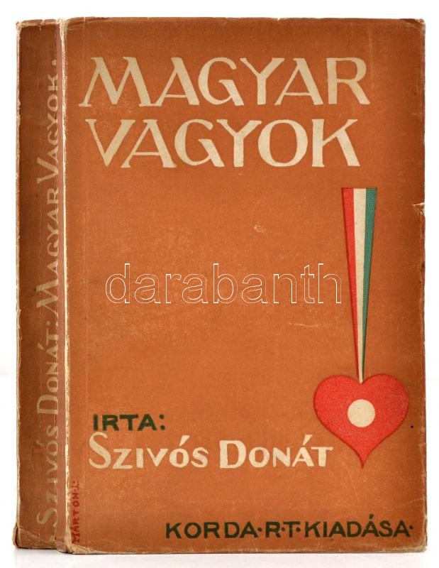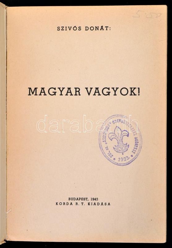 Szívós Donát: Magyar vagyok. A borító Márton Lajos munkája. Bp.,1943, Korda Rt. Kiadói papírkötés. 1922-es 221. sz. "Anonymus" cserkészcsapat bélyegzőjével.