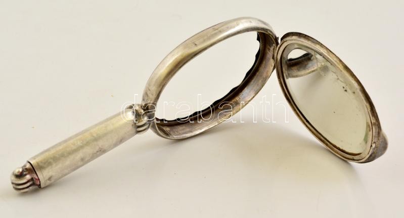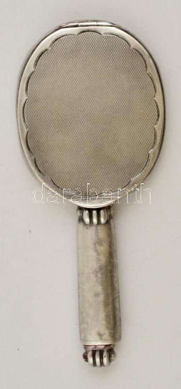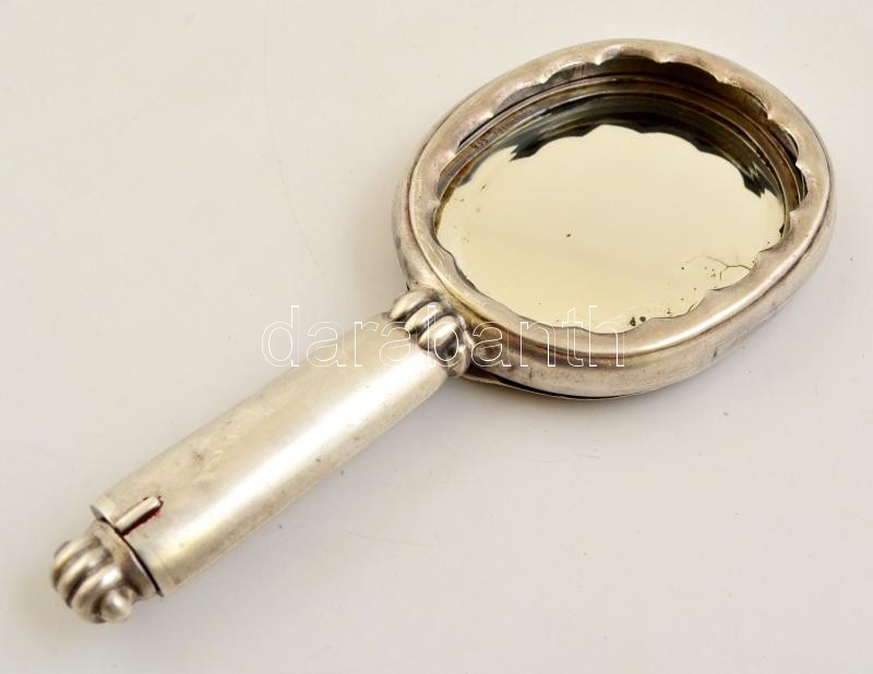 Leírás: Ezüst (Ag) sminktükör, nyelében rúzstartóval, jelzett, hiányos, h: 15 cm bruttó: 95,2 g