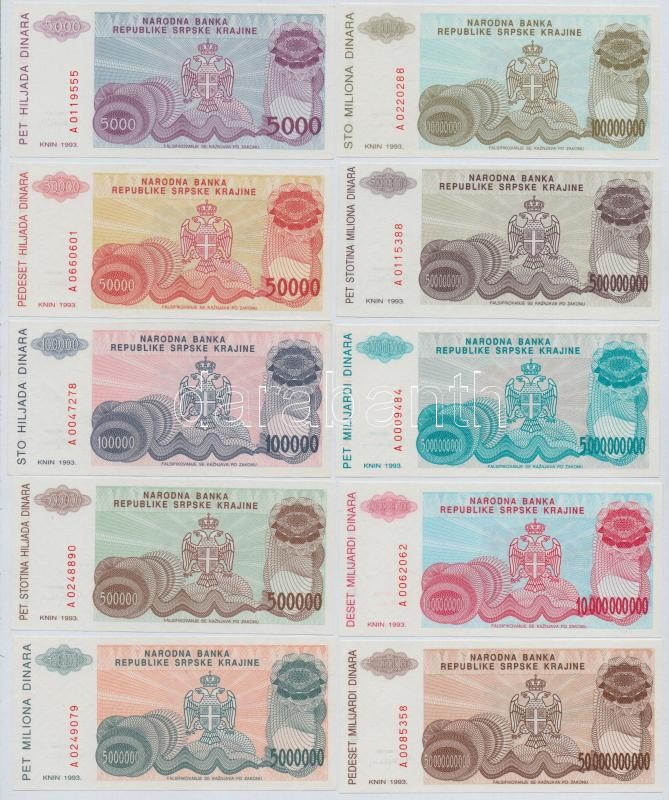 Coratia / Republic of Serbian Krajina 1993. 5000 Dinara + 50.000 Dinara + 100.000 Dinara + 500.000 Dinara + 5.000.000 Dinara + 100.000.000 Dinara + 500.000.000 Dinara + 5.000.000.000 Dinara + 10.000.000.000 Dinara + 50.000.000.000 Dinara C:UNC