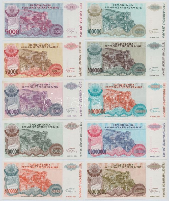 Leírás: Horvátország / Krajna Szerb Köztársaság 1993. 5000D + 50.000D + 100.000D + 500.000D + 5.000.000D + 100.000.000D + 500.000.000D + 5.000.000.000D + 10.000.000.000D + 50.000.000.000D T:I