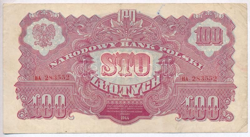 Poland 1944. 100 Zlotych C:F https://www.darabanth.com/hu/322-Gyorsarveres/322.0/Numizmatika/Kulfoldi-bankjegyek~2500012/Lengyelorszag-1944-100Zl-TIII-Poland-1944-100-Zlotych-CF~II1749933