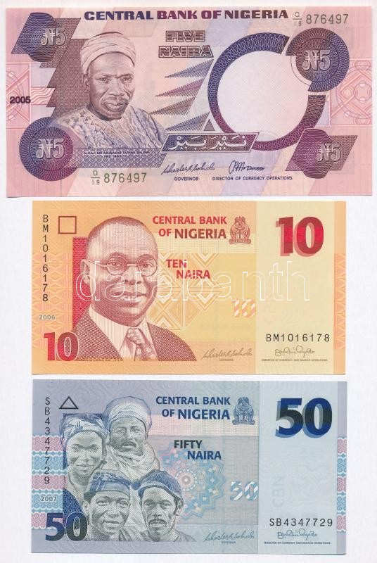Nigeria 2005. 5 Naira + ... https://www.darabanth.com/hu/322-Gyorsarveres/322.0/Numizmatika/Kulfoldi-bankjegyek~2500012/Nigeria-2005-5N-plus-2006-10N-plus-2007-50N-TI-Nigeria-2005-5-Naira-plus-2006-10-Naira-plus-2007-50-Nai~II1773383