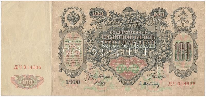 Russian Em... https://www.darabanth.com/hu/322-Gyorsarveres/322.0/Numizmatika/Kulfoldi-bankjegyek~2500012/Orosz-Birodalom-1912-1917-1910-100R-SzignShipov-TIII-Russian-Empire-1912-1917-1910-100-Rub~II1783883