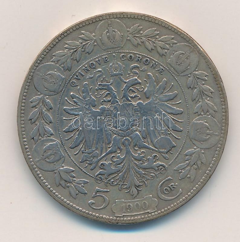 Austria 1900. 5 C... https://www.darabanth.com/hu/322-Gyorsarveres/322.0/Numizmatika/Kulfoldi-fem-es-ezustpenzek~2500013/Ausztria-1900-5K-Ag-Ferenc-Jozsef-T2--Austria-1900-5-Corona-Ag-Franz-Joseph-CVF-Krause-KM~II1786343