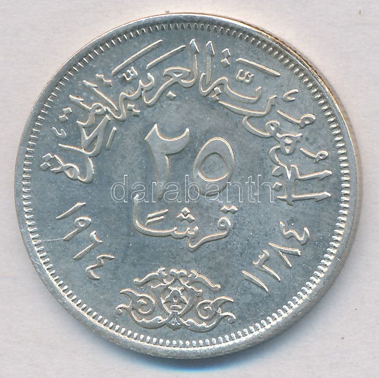 Egypt 1964. 25 Piastres Ag C:AU,XF https://www.darabanth.com/hu/322-Gyorsarveres/322.0/Numizmatika/Kulfoldi-fem-es-ezustpenzek~2500013/Egyiptom-1964-25p-Ag-T1-2-Egypt-1964-25-Piastres-Ag-CAU-XF~II1783377
