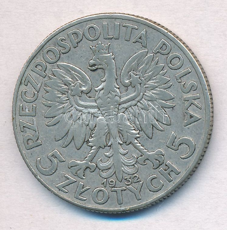 Poland 1932. 5 Zlotych Ag C:XF https://www.darabanth.com/hu/322-Gyorsarveres/322.0/Numizmatika/Kulfoldi-fem-es-ezustpenzek~2500013/Lengyelorszag-1932-5Zl-Ag-T2--Poland-1932-5-Zlotych-Ag-CXF~II1784674