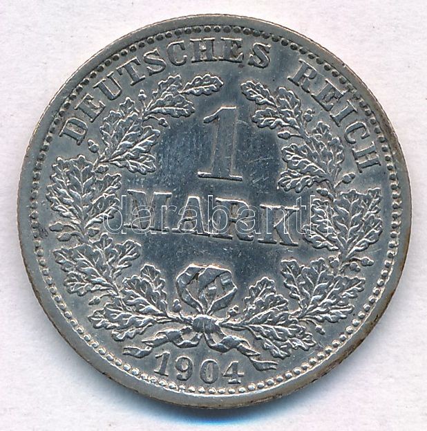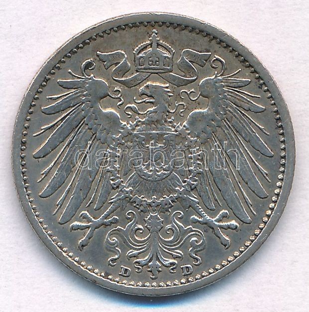 German Empire 1904D 1 Mark Ag C:XF https://www.darabanth.com/hu/322-Gyorsarveres/322.0/Numizmatika/Kulfoldi-fem-es-ezustpenzek~2500013/Nemet-Birodalom-1904D-1M-Ag-T2-German-Empire-1904D-1-Mark-Ag-CXF~II1785194