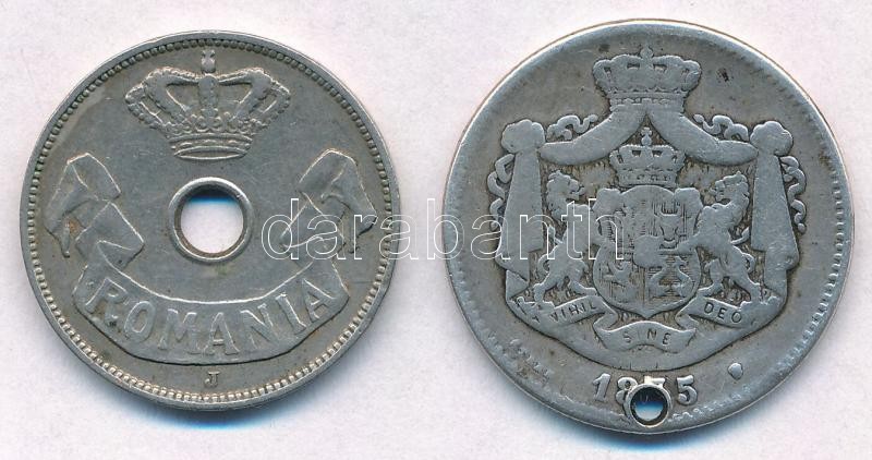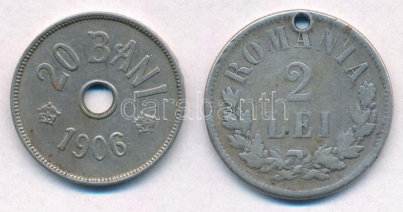 Romania 1875. 2 Lei Ag + 1906. 20 Bani Cu-Ni "Carol I" C:XF-F hole