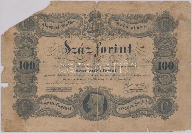 Hungary 1848. 1... https://www.darabanth.com/hu/322-Gyorsarveres/322.0/Numizmatika/Magyar-bankjegyek~2500007/1848-100Ft-Kossuth-banko-TIV-anyaghiany-Hungary-1848-100Ft-Kossuth-banknote-CG-missing-ma~II1786623