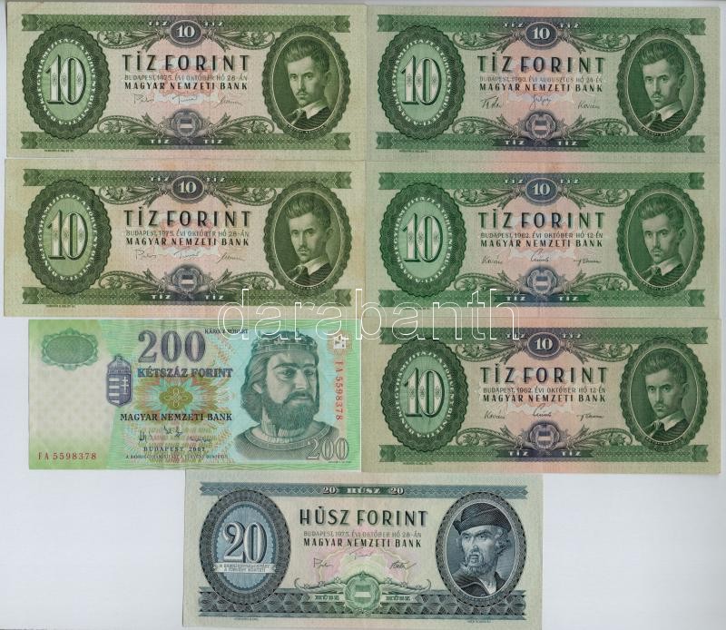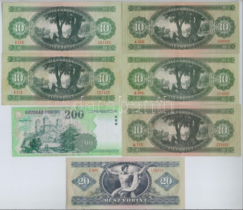 Vegyes: 1960. 10Ft + 1962. 10Ft (2x) + 1975. 10Ft (2x) + 20Ft + 2007. ... https://www.darabanth.com/hu/322-Gyorsarveres/322.0/Numizmatika/Magyar-bankjegyek~2500007/Vegyes-1960-10Ft-plus-1962-10Ft-2x-plus-1975-10Ft-2x-plus-20Ft-plus-2007-200Ft-TII-III~II1787286