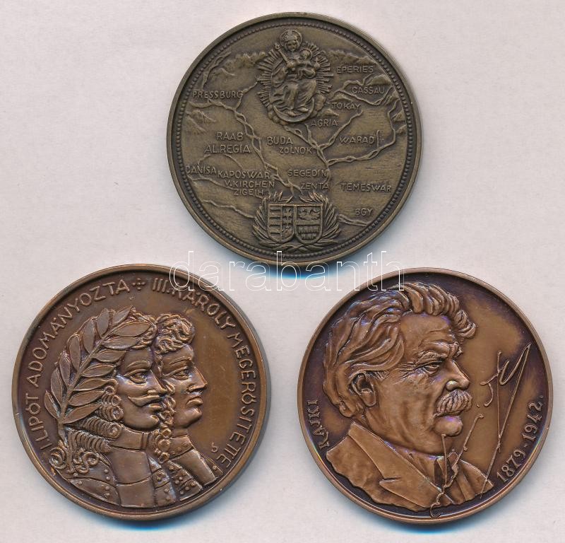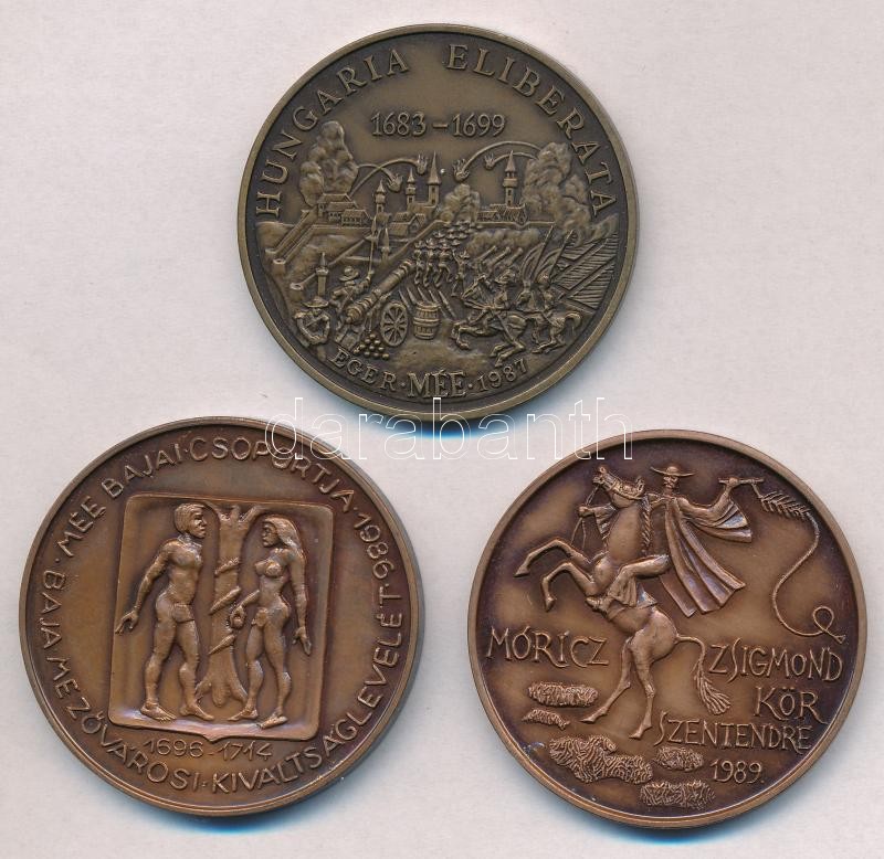 Leírás: Bartos Endre (1930-2006) 1986. "MÉE Bajai Csoport - Baja mezővárosi kiváltságlevelének évfordulója" Br emlékérem (42,5 mm) + Bognár György (1944-) 1987. "Hungaria Eliberata 1683-1699 - Eger MÉE 1987" Br emlékérem (42,5mm) + Rajki László (1939-) 1989. "Móricz Zsigmond Kör Szentendre" Br emlékérem (42,5mm) T:1-,2