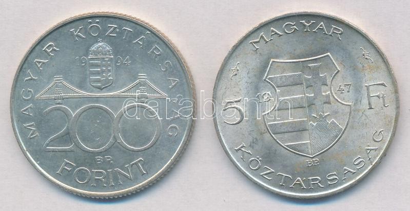 Leírás: 1947. 5Ft Ag "Kossuth" + 1994. 200Ft Ag "Deák" T:2