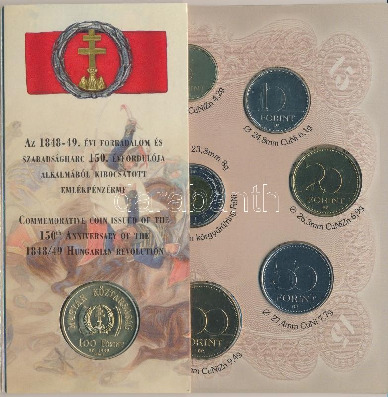 Leírás: 1998. 50f-200Ft (10xklf) forgalmi sor dísztokban + 1998. 100Ft alpakka "1848-1849. Szabadságharc 150. évfordulójára" T:BU patina