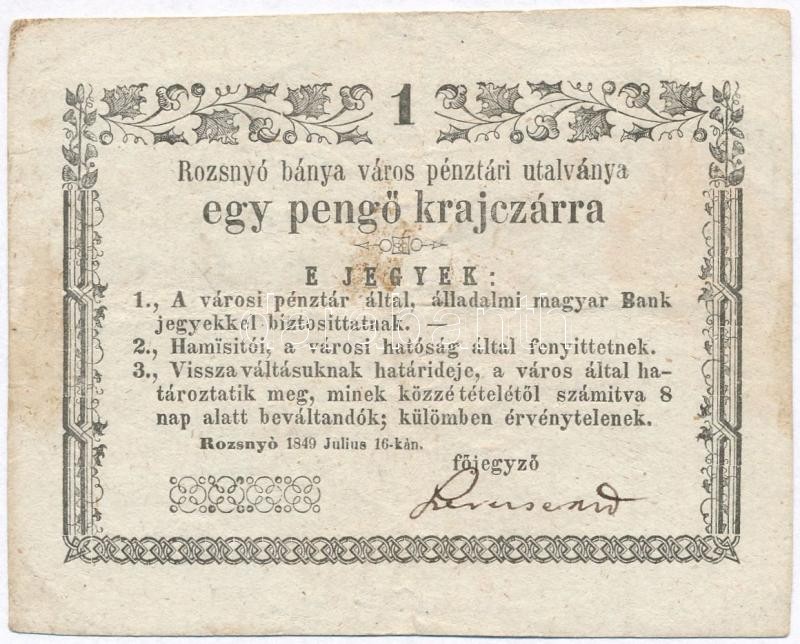 Rozsnyó 1849. 1kr "Rozsnyó bánya város pénztári utalványa" T... https://www.darabanth.com/hu/322-Gyorsarveres/322.0/Numizmatika/Papir-es-fem-szuksegpenzek~2500006/Rozsnyo-1849-1kr-Rozsnyo-banya-varos-penztari-utalvanya-TIII~II1782563
