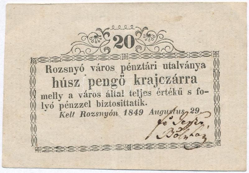 Leírás: Rozsnyó 1849. 20kr "Rozsnyó város pénztári utalványa" T:III szép papír ROZ-2.1