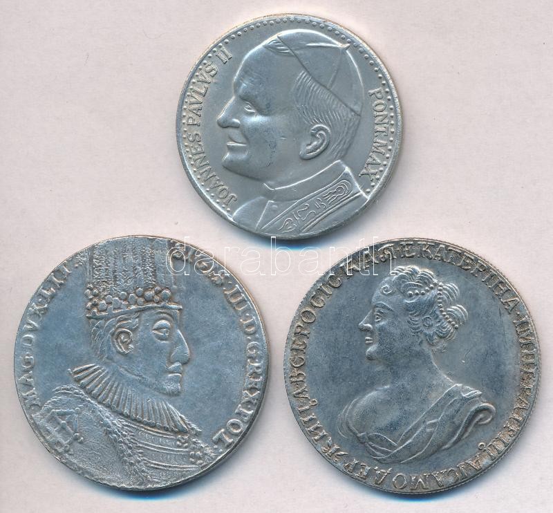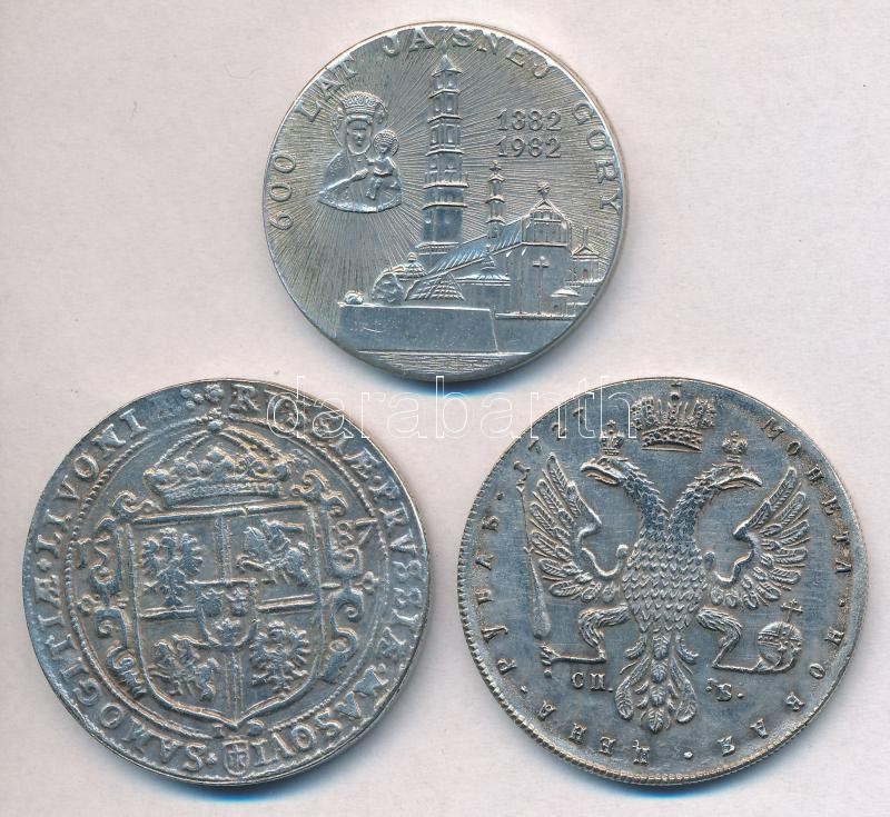 Lengyel Királyság 1587. Tallér "III. Zsigmond" Fe hamisítvány + Lengyelország 1982. "II. János Pál pápa / 600 éves a Jasna Góra-i kolostor 1382-1982" ezüstözött fém emlékérem (35mm) + Orosz Birodalom 1727. 1R "I. Katalin" Fe hamisítvány T:2