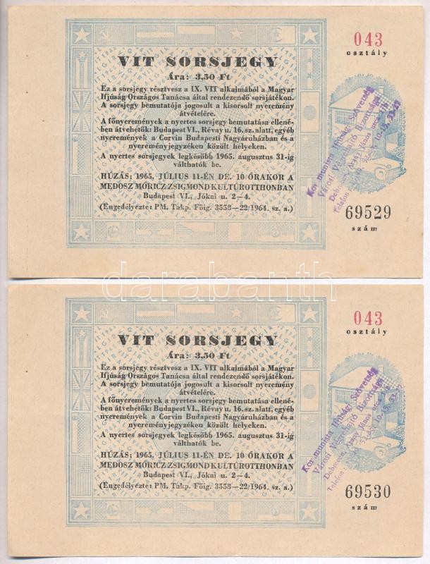 Leírás: Budapest 1959. "VIT" sorsjegy 3,5Ft értékében (2x) sorszámkövető, "Kommunista Ifjúsági Szövetség Városi Végrehajtó Bizottsága" bélyegzéssel T:II