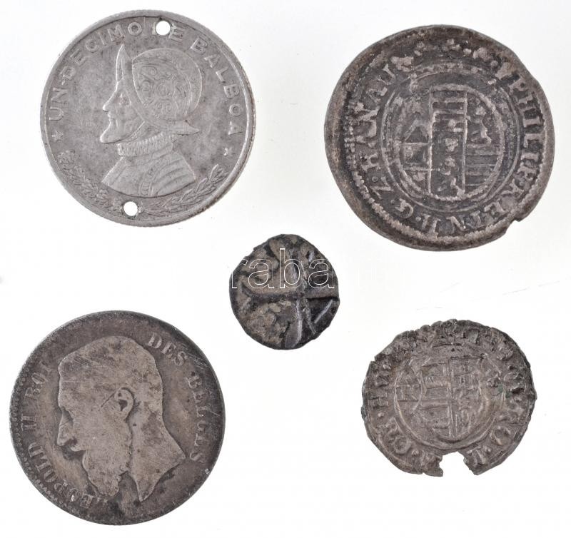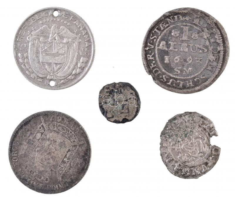 Leírás: 5db-os vegyes magyar és külföldi rossz tartású, sérült ezüstpénz tétel T:2-,3 ly.