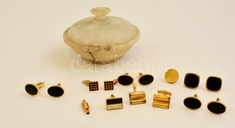 Leírás: Alabástrom tégely, benne mandzsettagombokkal, d: 11 cm, m: 7 cm