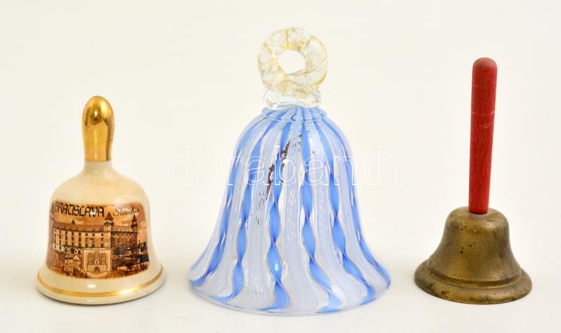 Leírás: Fém, porcelán, üveg asztali csengettyűk, 3 db