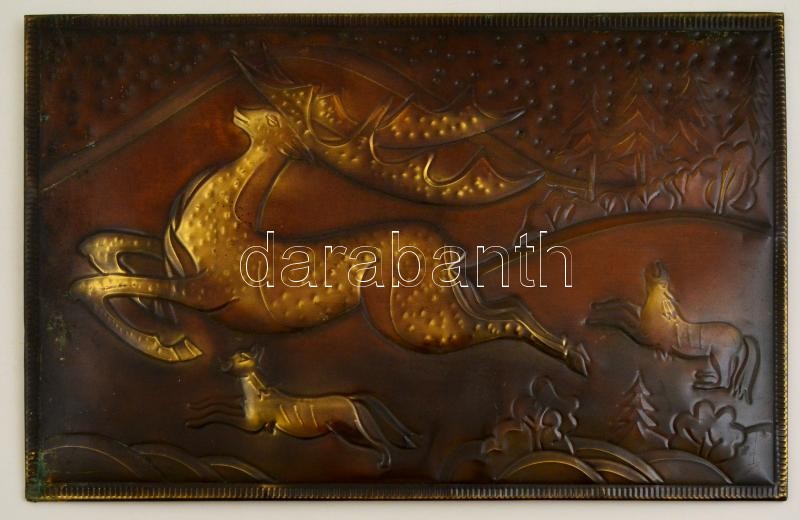 Leírás: Réz lemez borítású falikép, Csodaszarvas, 42×27 cm