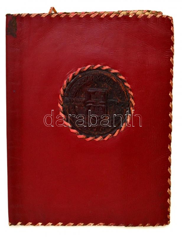Leírás: cca 1920-1940 Budapest címerrel díszített vörös, bőr könyvborító, folttal, 23x18 cm.