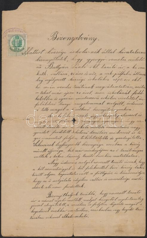 1895 Csíkpálfalva, bizonyítvány Buttyán László gyergyóremetei születésű iskolai tanító részére, amelyben érdemeiért (a falu két nemzetiségű, két felekezettel rendelkező lakosai között súrlódások nem voltak az ő idejében) előléptetésre, kitüntetésre vagy jutalmazásra érdemesnek találják, Csíkpálfalva községi iskolaszék pecsétjével, plébános-iskolaszéki elnök, és alelnök aláírásaival, és "Csíkdelne nemes megye" pecsétjével, 15 kr. okmánbélyeggel, hajtásnyomokkal, a hajtásnyomok mentén szakadásokkal