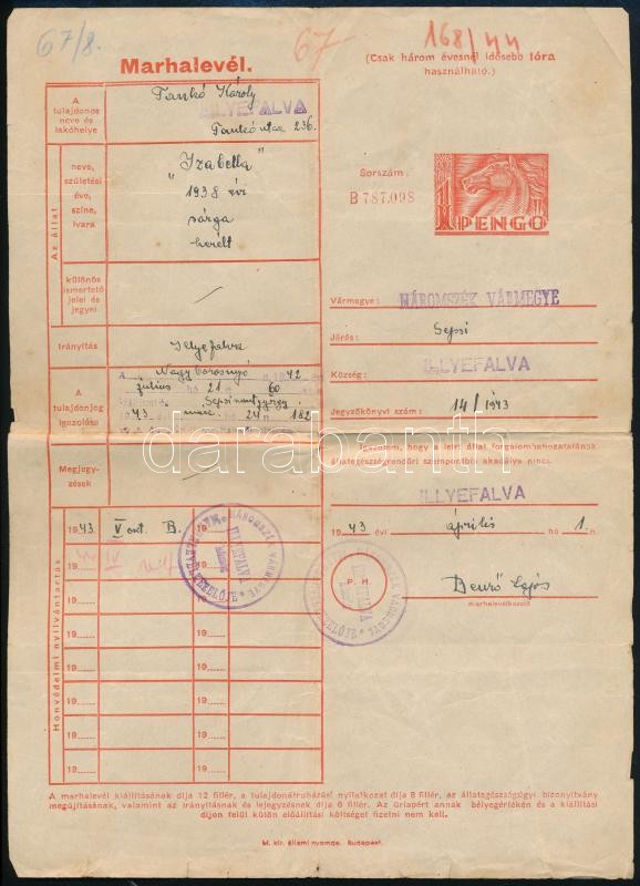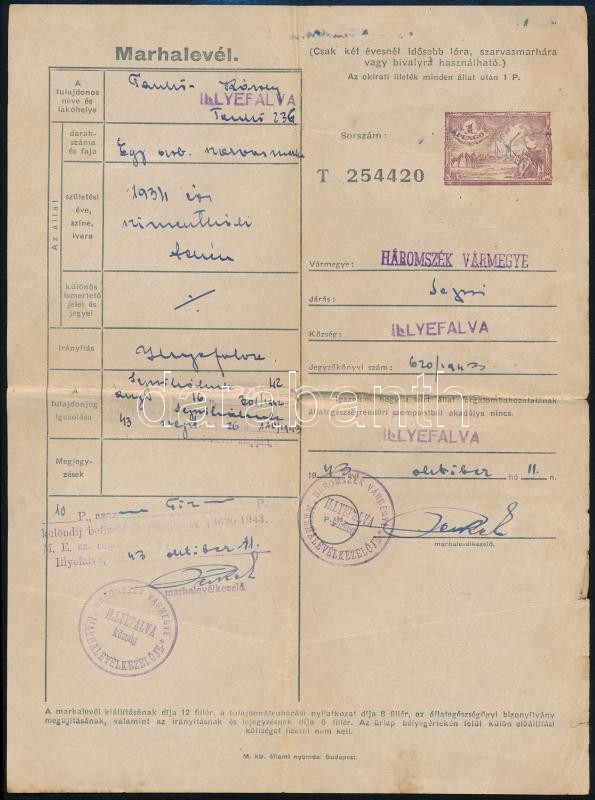 1943 Illyefalva (Háromszék), 2 db marhalevél https://www.darabanth.com/hu/323-Gyorsarveres/323.0/Festmeny-mutargy-papirregiseg-egyeb/Okmanyok~500016/1943-Illyefalva-Haromszek-2-db-marhalevel~II1791640