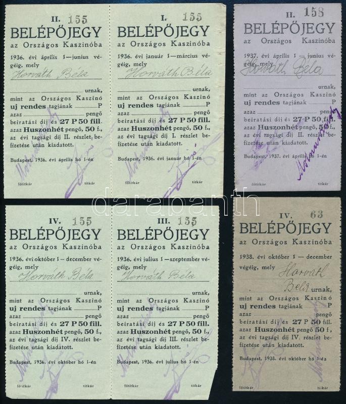 Leírás: cca 1935 6 db belépőjegy az Országos Kaszinóba