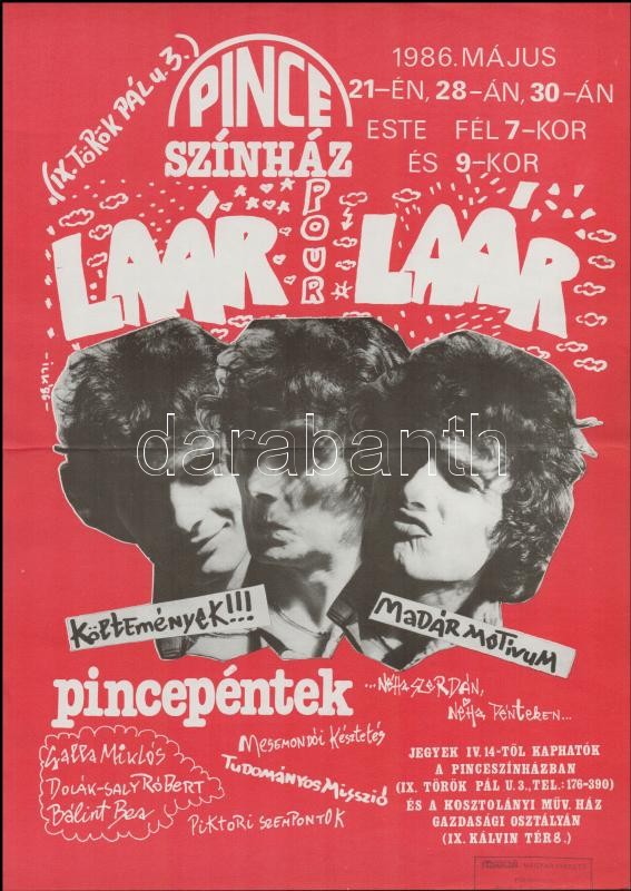 1986 Pince Színház Laár Pour Laár társulat ( Laár András, Galla Miklós... https://www.darabanth.com/hu/323-Gyorsarveres/323.0/Festmeny-mutargy-papirregiseg-egyeb/Plakat~500029/1986-Pince-Szinhaz-Laar-Pour-Laar-tarsulat-Laar-Andras-Galla-Miklos-Dolak-Saly-Robert-~II1780334