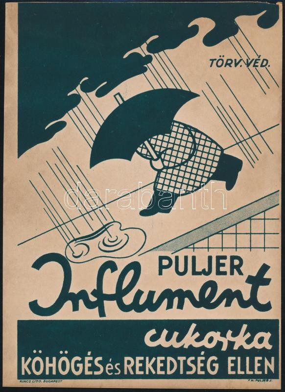 cca 1930 Puljer Influment cukorka reklám plakát, Kincs Lito., 33x23 cm https://www.darabanth.com/hu/323-Gyorsarveres/323.0/Festmeny-mutargy-papirregiseg-egyeb/Plakat~500029/cca-1930-Puljer-Influment-cukorka-reklam-plakat-Kincs-Lito-33x23-cm~II1778720