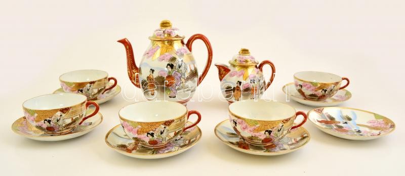 Leírás: Hiányos kínai porcelán teás készlet. Kézzel festett, jelzett, egyik kiöntőn lepattanás