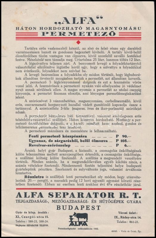 Leírás: cca 1920-1930 Bp., "Alfa" háton hordozható magasnyomású permetező, Alfa Separator Rt. tejgazdasági, mezőgazdasági és hűtőgépek gyára reklámos szórólap