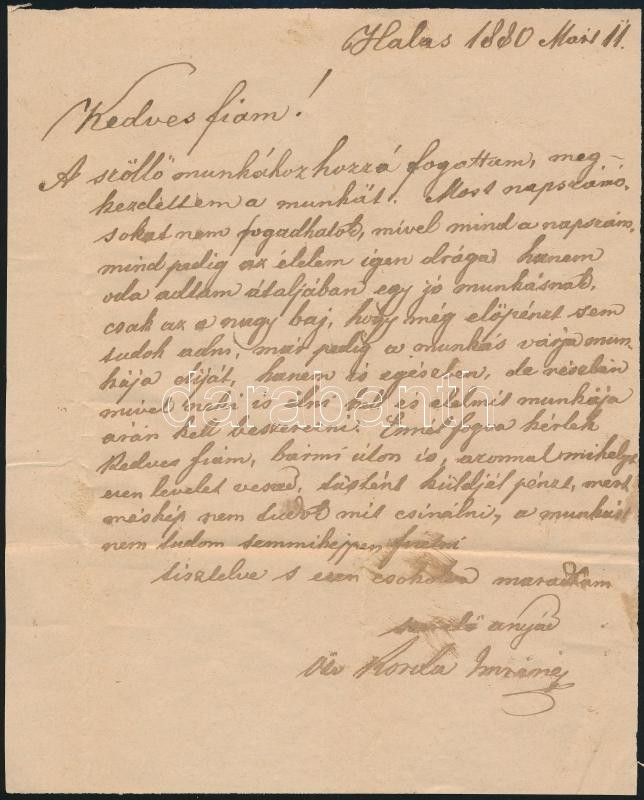 1880 Halas, édesanya levele fiának szőlőmegmunkálás és munkások megfiz... https://www.darabanth.com/hu/323-Gyorsarveres/323.0/Festmeny-mutargy-papirregiseg-egyeb/Tortenelmi-dokumentumok-keziratok-erdekessegek~500017/1880-Halas-edesanya-levele-fianak-szolomegmunkalas-es-munkasok-megfizetese-ugyeben-magy~II1793408