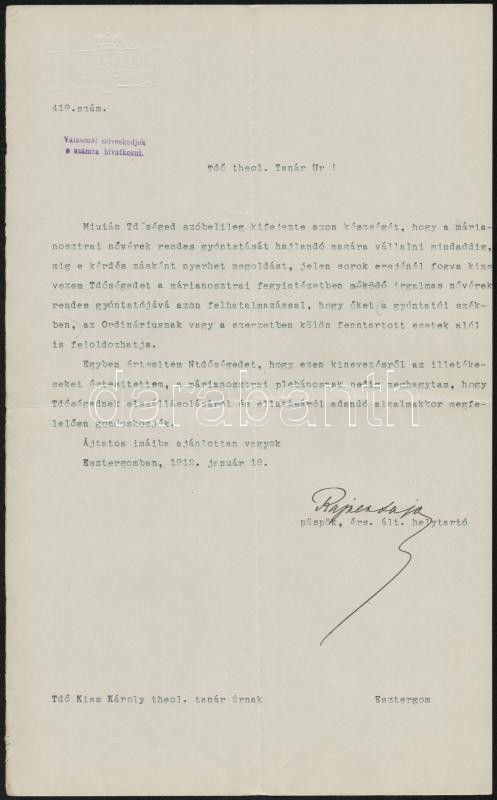1912 Rajner Lajos (1842-1920) püspök, érseki helynök saját kezű aláírása levélen Kiss Károly teológiai tanár, a bécsi Pázmáneum későbbi rektora részére, melyben kinevezi a márianosztrai fegyintézeti nővérek gyóntatójává