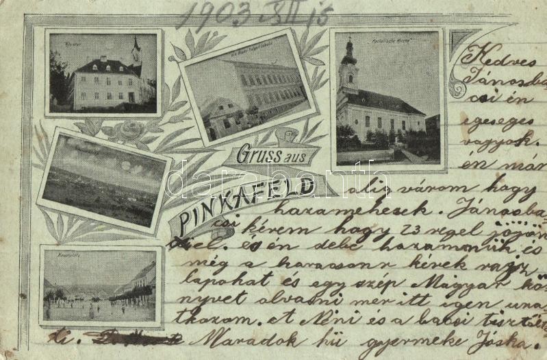 Pinkafő, Pinkafeld; Kloster, Hauptplatz, Schule, Katholische Kirche / Zárda, M. k. állami polgári iskola, Fő tér, Római katolikus templom / monastery, school, main square, Catholic church. Art Nouveau, floral (kis szakadás / small tear)
