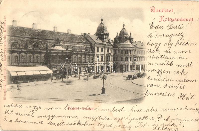 Leírás: 1899 Kolozsvár, Cluj; Fő tér, Reményik L. és fia, Böckel, Jeney Lajos üzlete. Bizományi Antiquár és könyvkereskedés kiadása / main square, shops