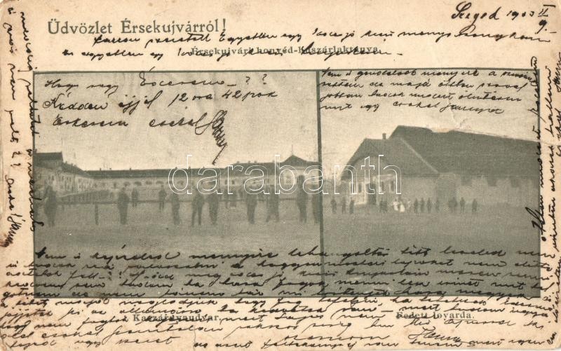 Leírás: 1903 Érsekújvár, Nové Zámky; honvéd huszárlaktanya, udvar, fedett lovarda / hussar military barracks, riding hall (r)
