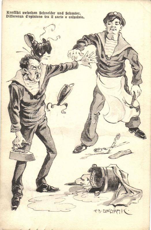 Leírás: Konflikt zwischen Schneider und Schuster / K.u.K. Kriegsmarine mariner humour art postcard. C. Fano Pola 1912/13. s: Ed. Dworak (EK)