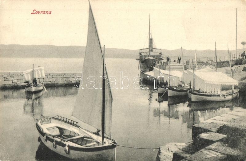 Lovran, Laurana, Lovrana; Port with boats, "Ernest" boat https://www.darabanth.com/hu/323-Gyorsarveres/323.0/Kepeslapok/Horvatorszag-Delvidek~2500009/Lovran-Laurana-Lovrana-Port-with-boats-Ernest-boat~II1795545